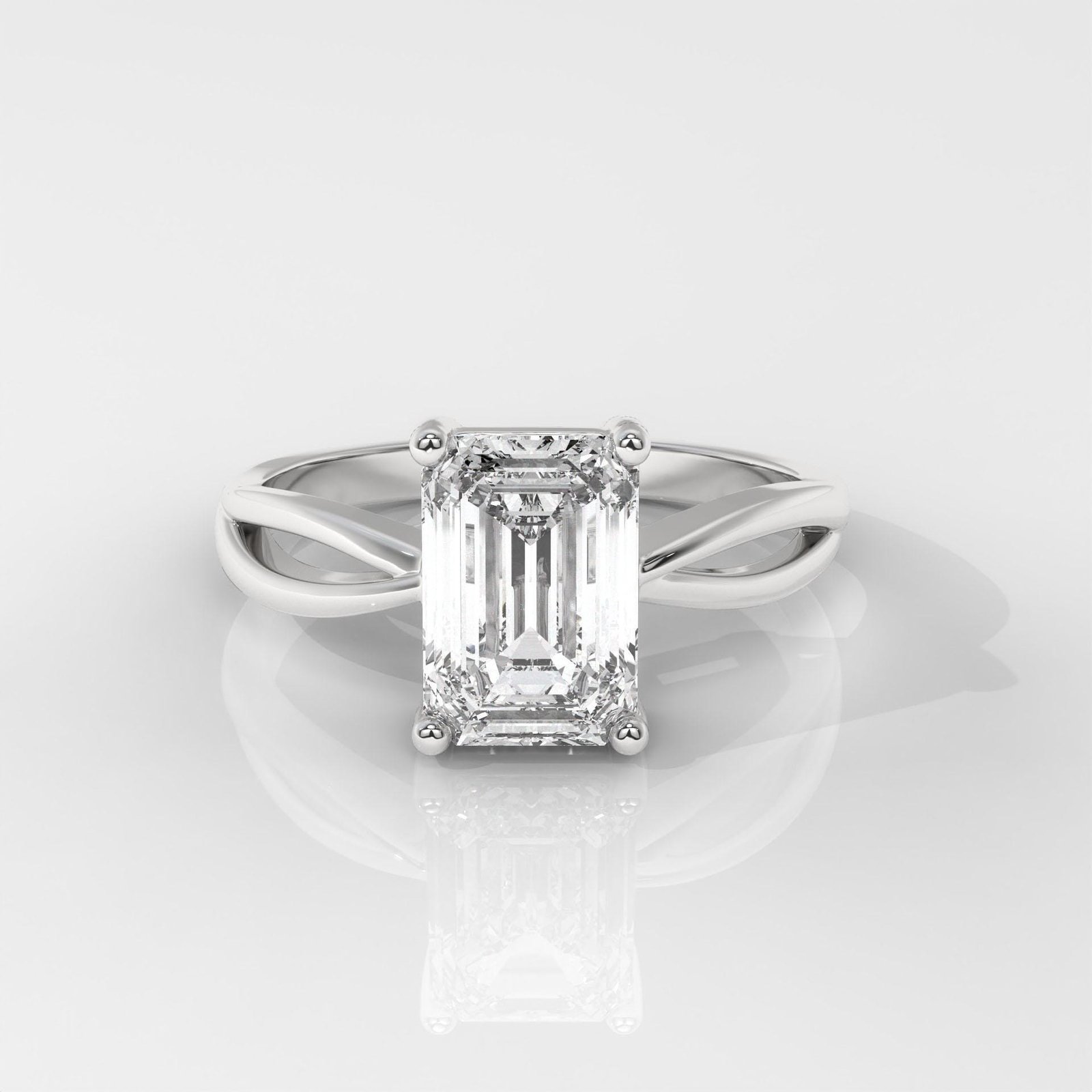 The unique split shank design gracefully frames the center stone, drawing the eye to the clean lines and mirror-like facets of the emerald cut. With its understated glamour and elongated silhouette, this ring is an elegant expression of lasting commitment and contemporary style.