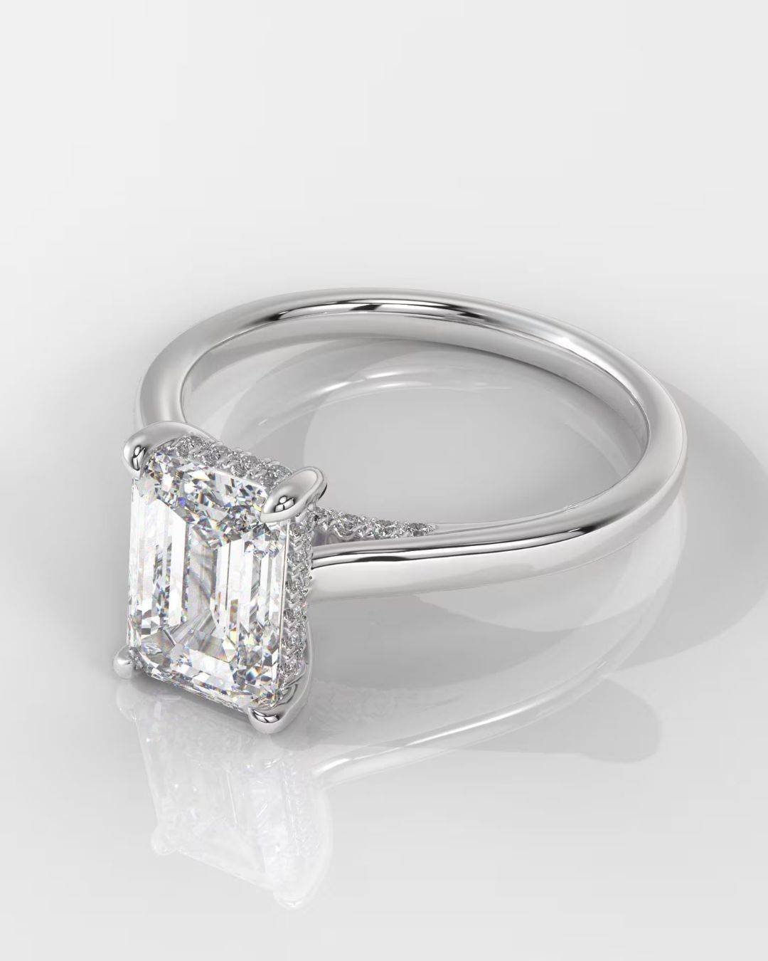 Elegant and timeless, this IGI-certified emerald cut lab-grown diamond engagement ring features a hidden halo and side stones in DEF/VVS–VS quality. Available in 14K white, yellow, or rose gold. Custom sizes and center stone weights from 1 to 3.5 carats. Made to order.