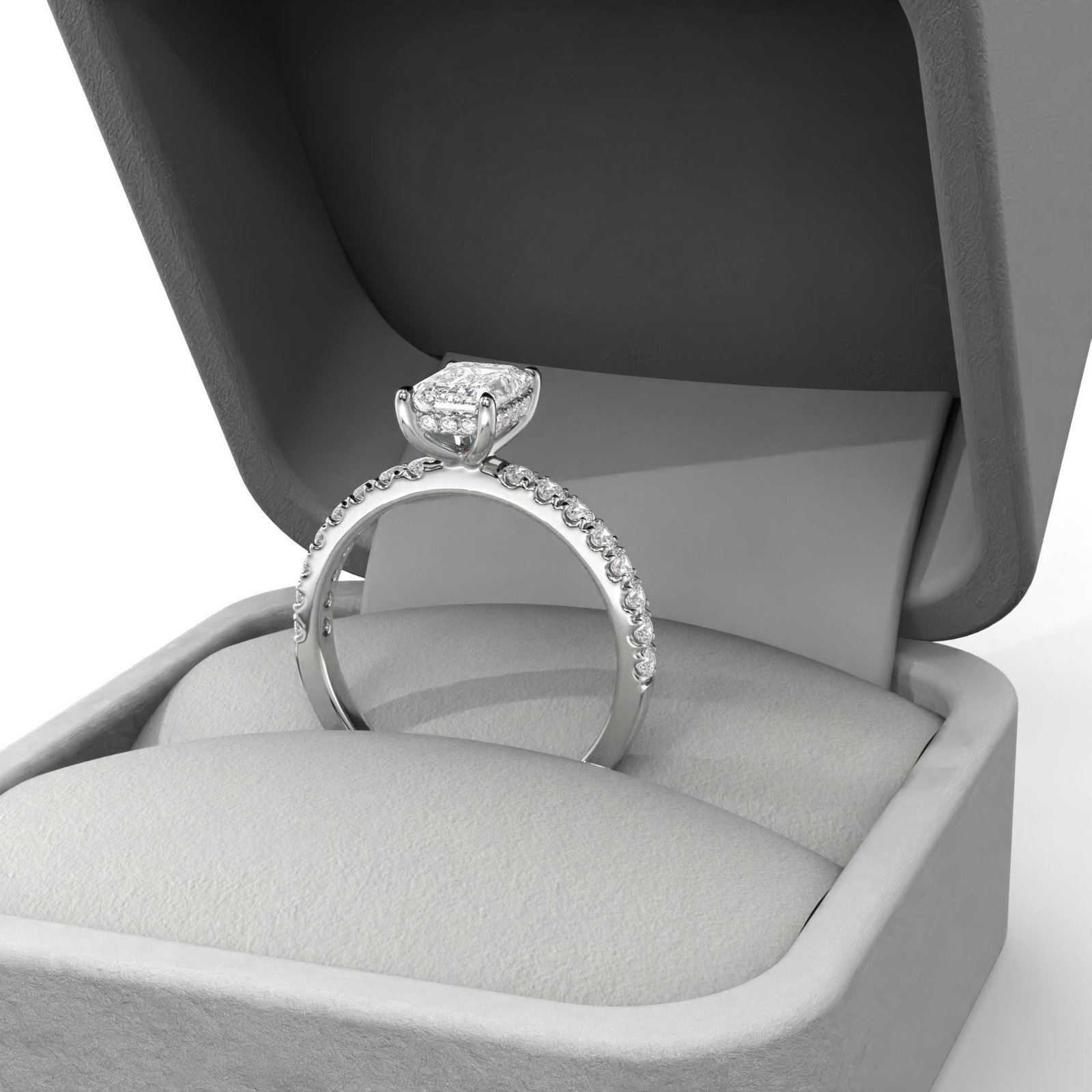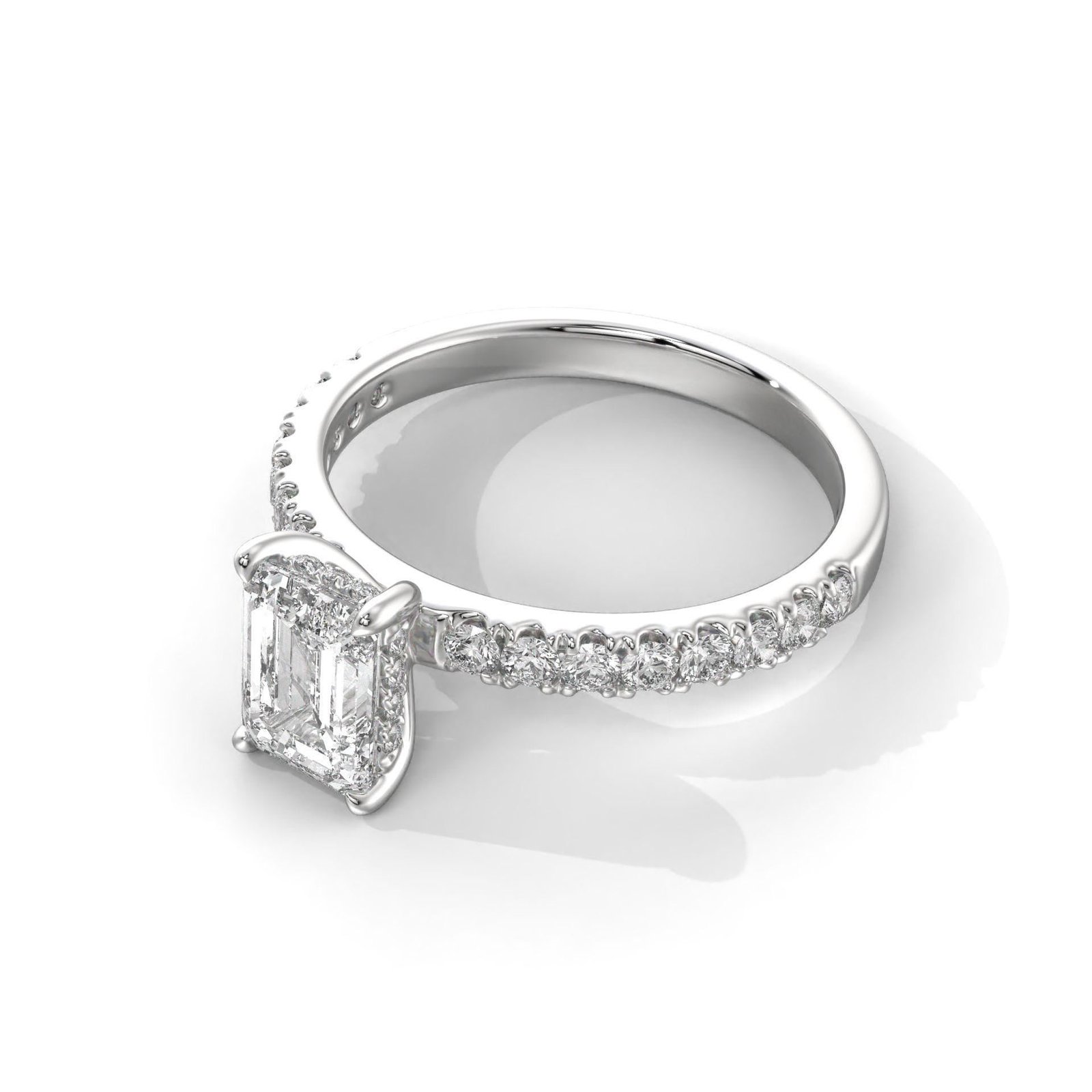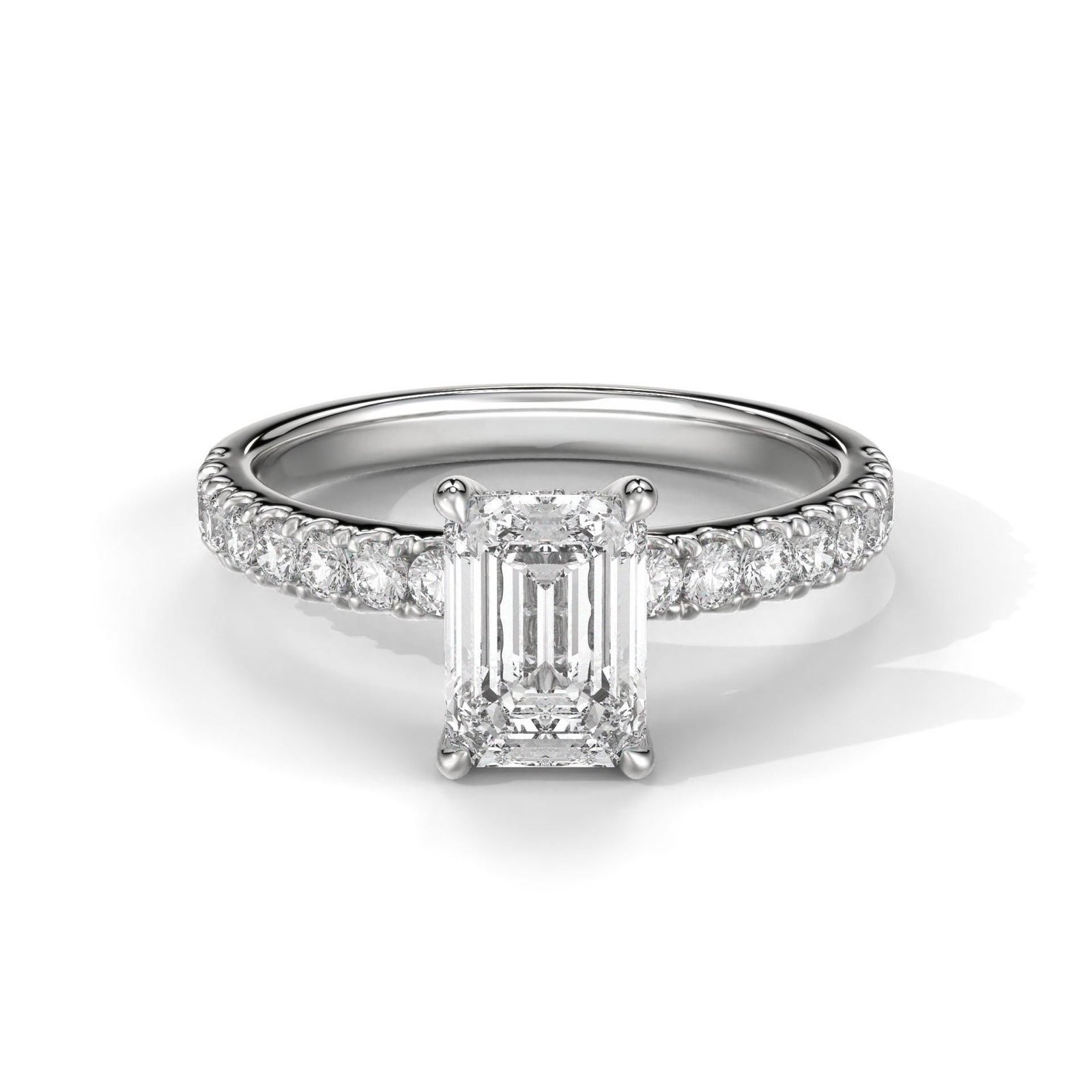 The hidden halo design adds a touch of sparkle beneath the center stone, making the diamond appear even more radiant from every angle. Round Brilliant side stones, totaling 0.50 carats, enhance the ring’s brilliance without distracting from the clean lines of the emerald cut.