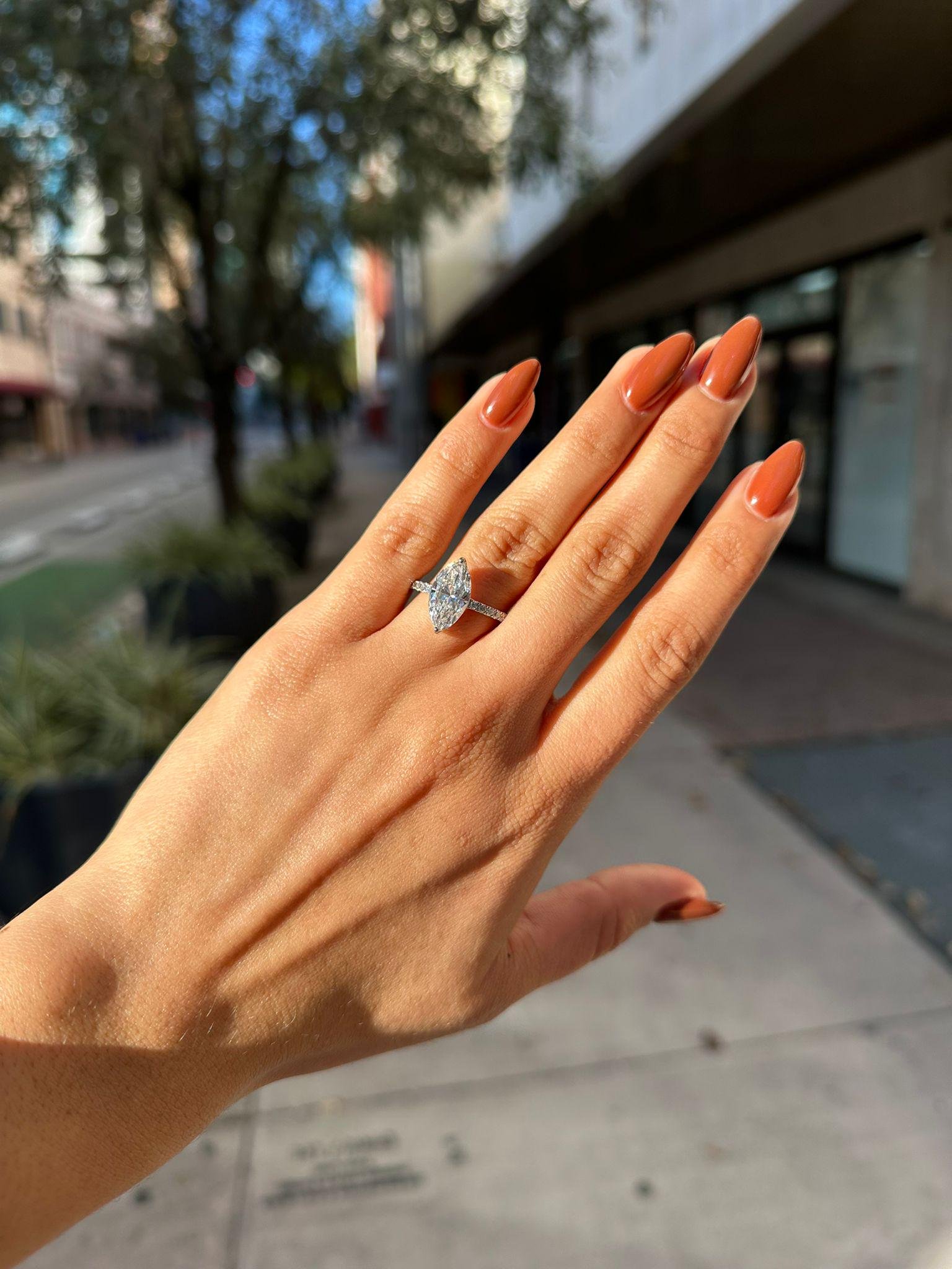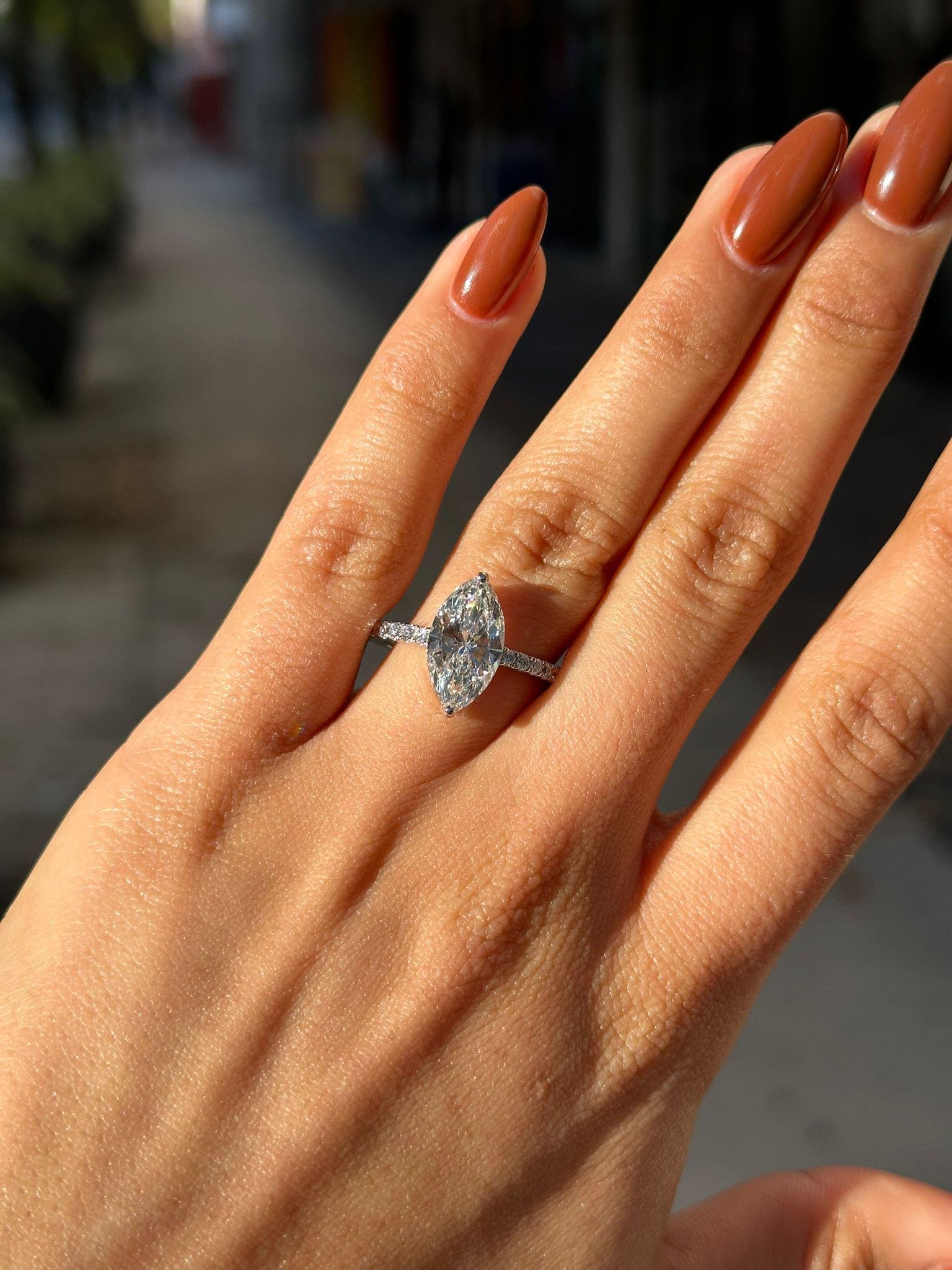 Elevate your love story with the Marquise Cut Diamond Engagement Ring with Pave Band by OTP Jewelry. This exquisite piece features an IGI-certified marquise lab-grown diamond, known for its elongated shape that flatters the hand while maximizing sparkle. The sleek 14K gold band is adorned with pave-set round brilliant diamonds, adding delicate shimmer and enhancing the beauty of the center stone.