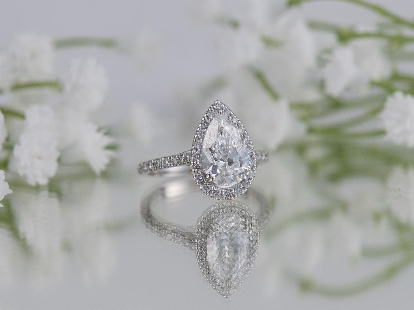 A romantic Pear Cut Hidden Halo Engagement Ring by OTP Jewelry, featuring an IGI-certified lab-grown pear diamond that sparkles with exceptional fire. The hidden halo and delicate side stones amplify brilliance while maintaining a graceful, modern silhouette — perfect for proposals, anniversaries, or anyone who loves refined glamour.