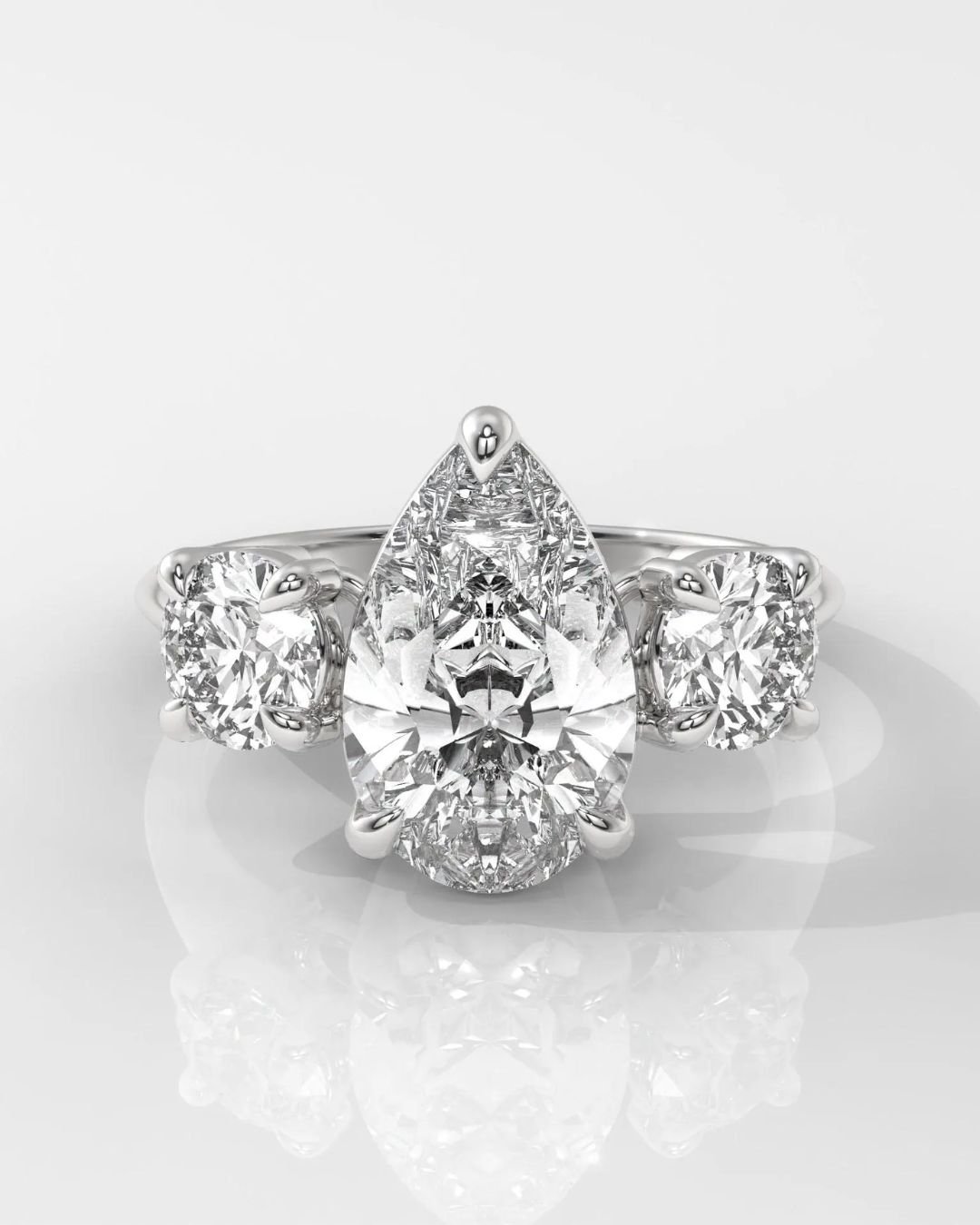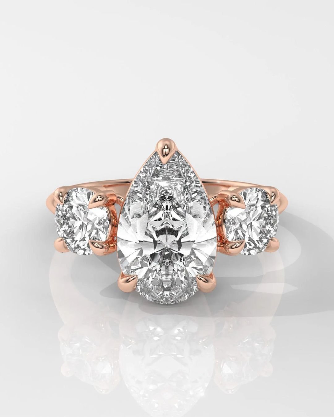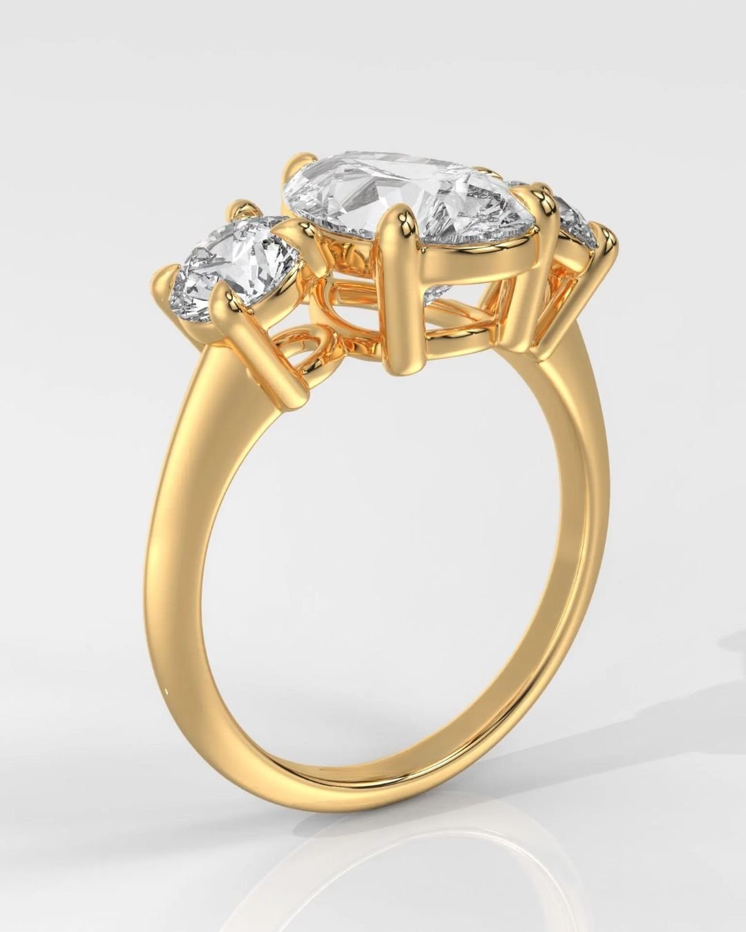 Elegant and eye-catching, this Three-Stone Engagement Ring features a stunning Pear Brilliant lab grown center diamond, flanked by two sparkling round brilliant side stones. All diamonds are IGI certified with DEF color and VVS–VS clarity, set in your choice of 14K white, yellow, or rose gold.
