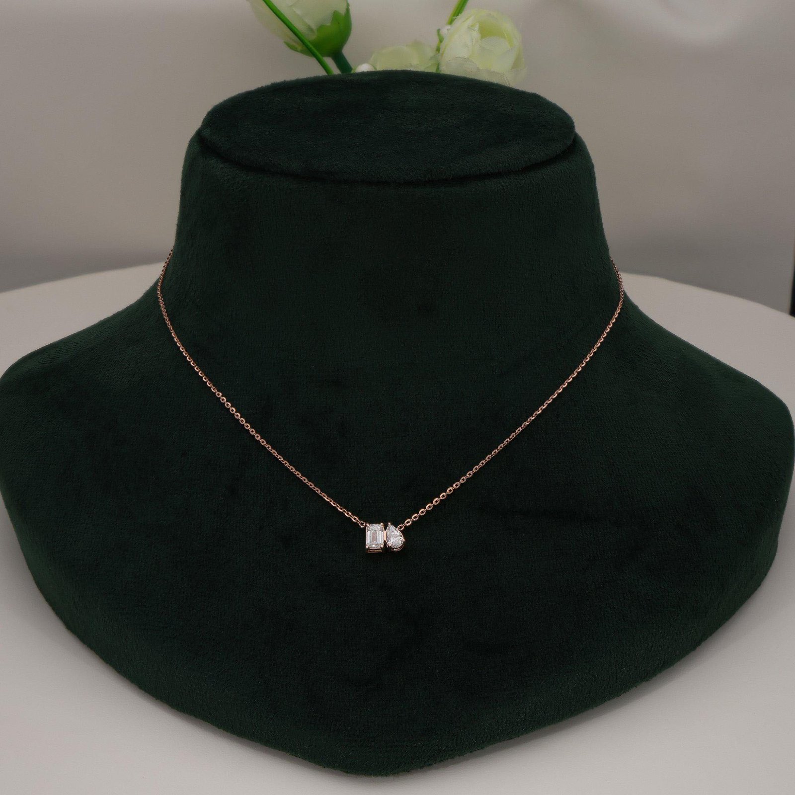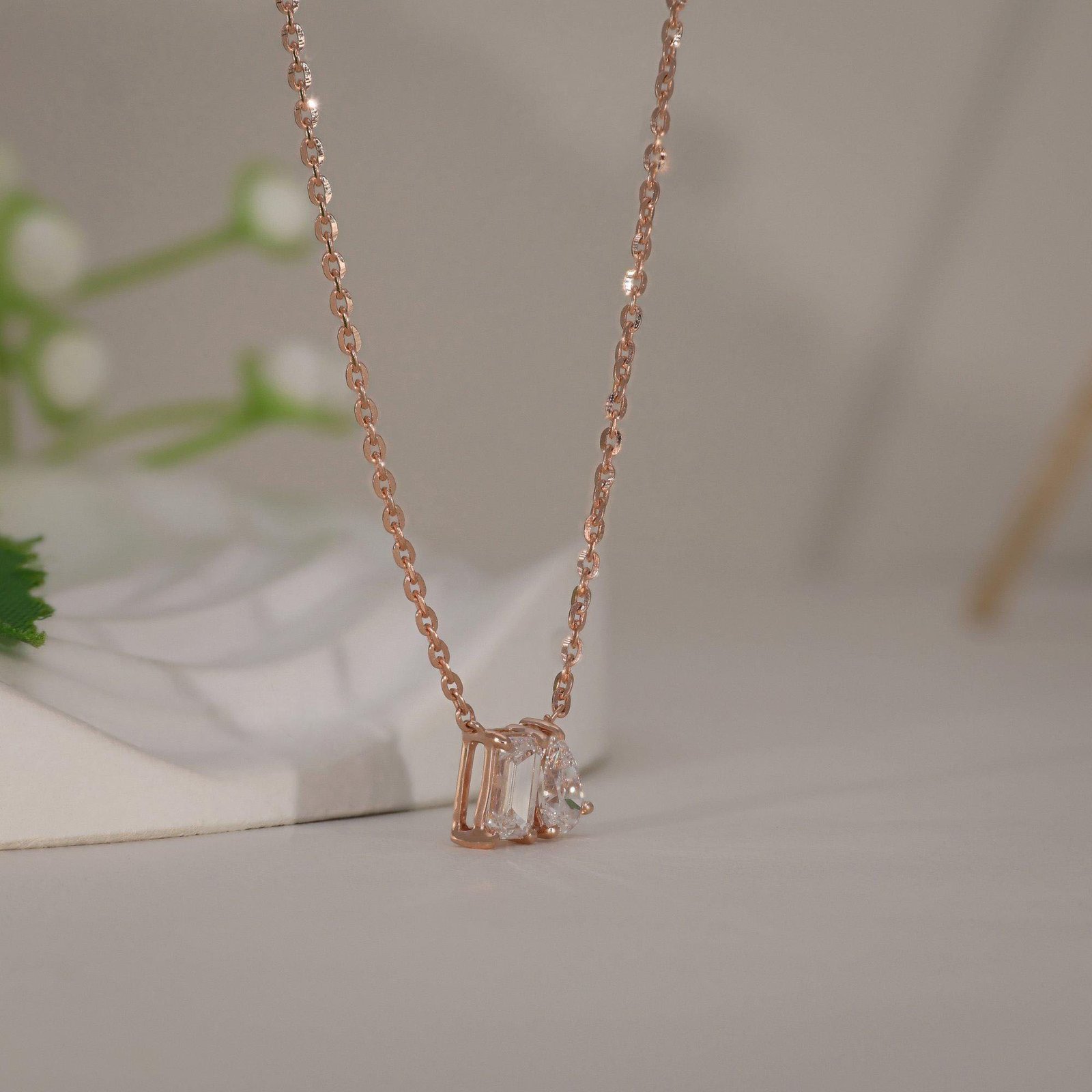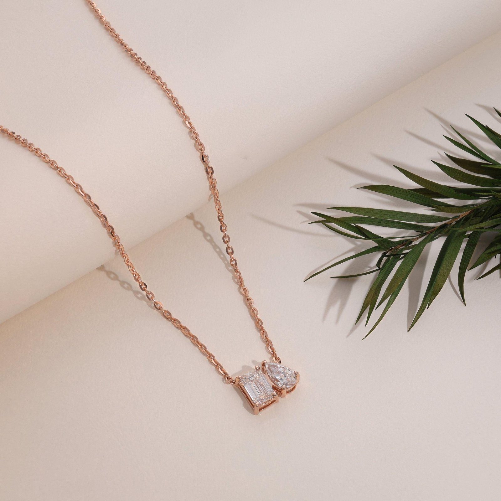 Romantic Toi et Moi Necklace in 14K Rose Gold featuring IGI Certified Pear & Emerald-Cut Lab Grown Diamonds. 2 CT Total Weight, Customizable, and Made to Order.