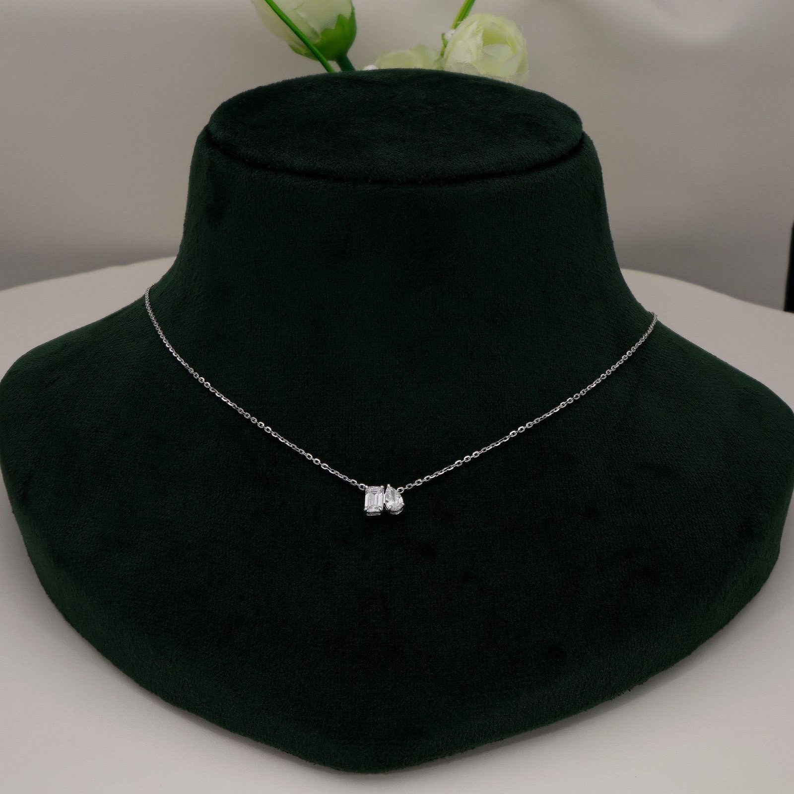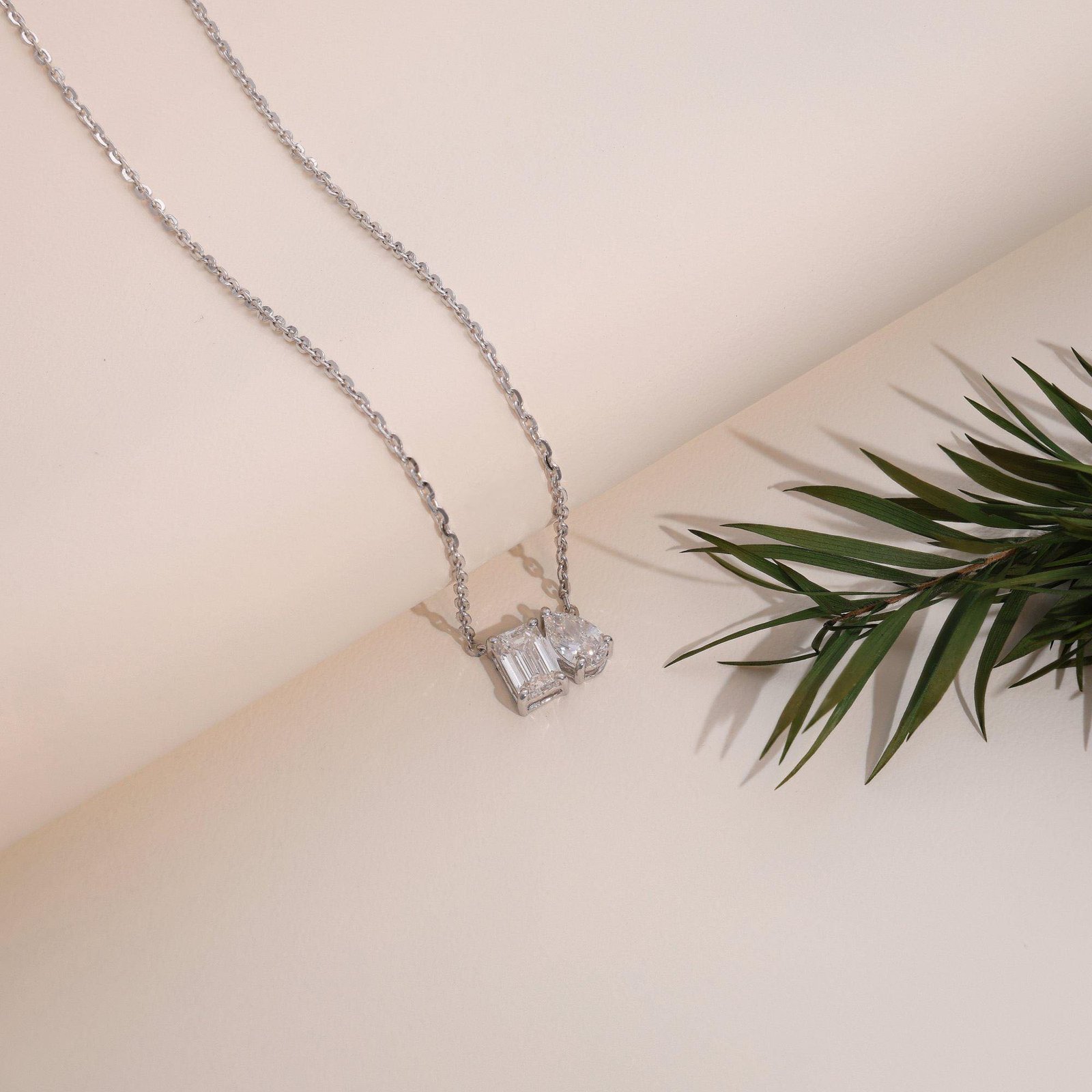 Elegant Toi et Moi Necklace featuring Pear & Emerald-Cut IGI Certified Lab Grown Diamonds in 14K White Gold. 2 CT Total Weight. Made to order with customizable diamond sizes and chain length.