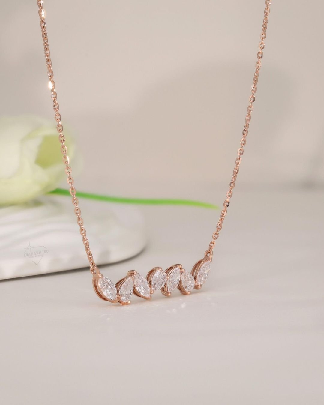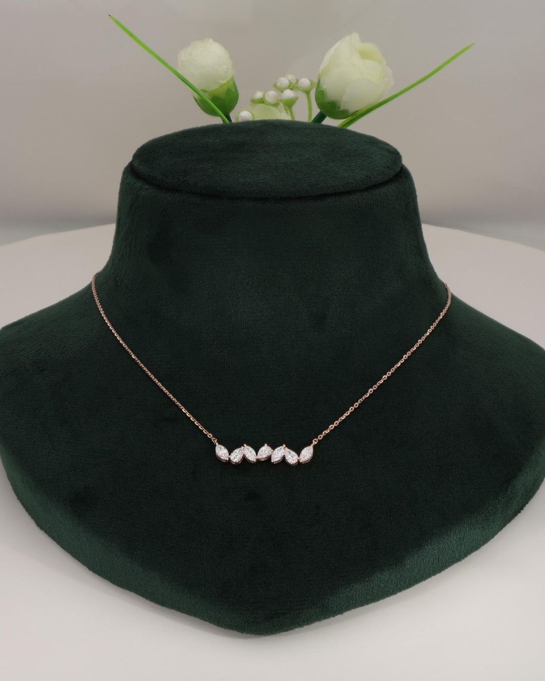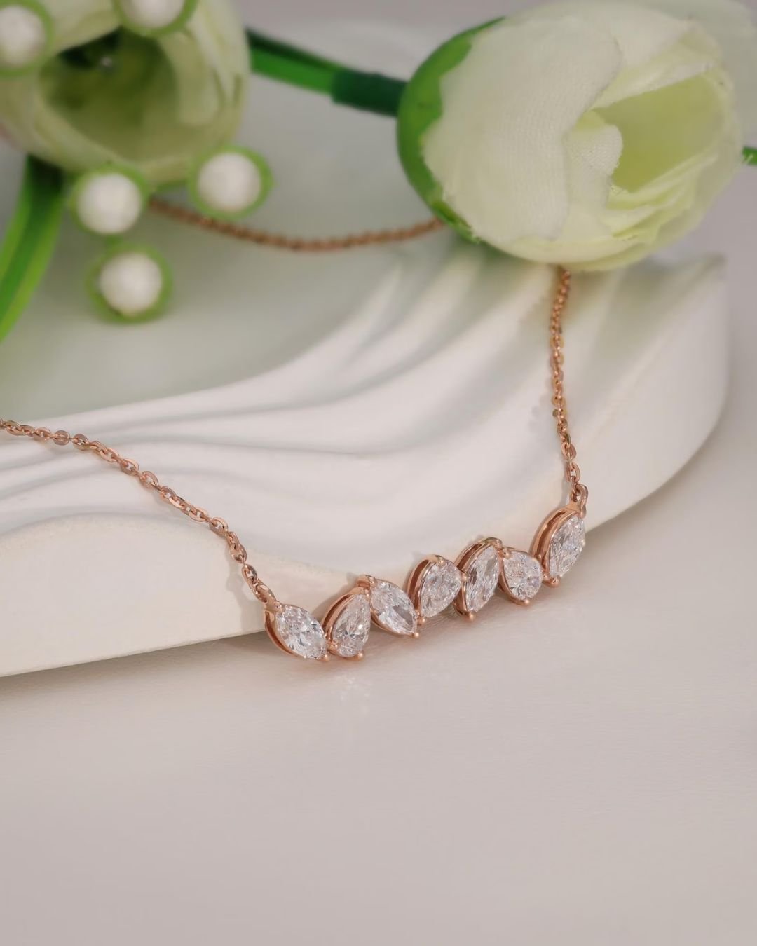 Add a touch of refined elegance to any outfit with this stunning 14K rose gold cluster necklace, showcasing a sparkling combination of 4 marquise brilliant and 3 pear brilliant lab-grown diamonds. Together, these diamonds total 1 carat of exquisite brilliance, with DEF color and VVS–VS clarity, certified by CVD lab-grown technology for ethical luxury and lasting sparkle.