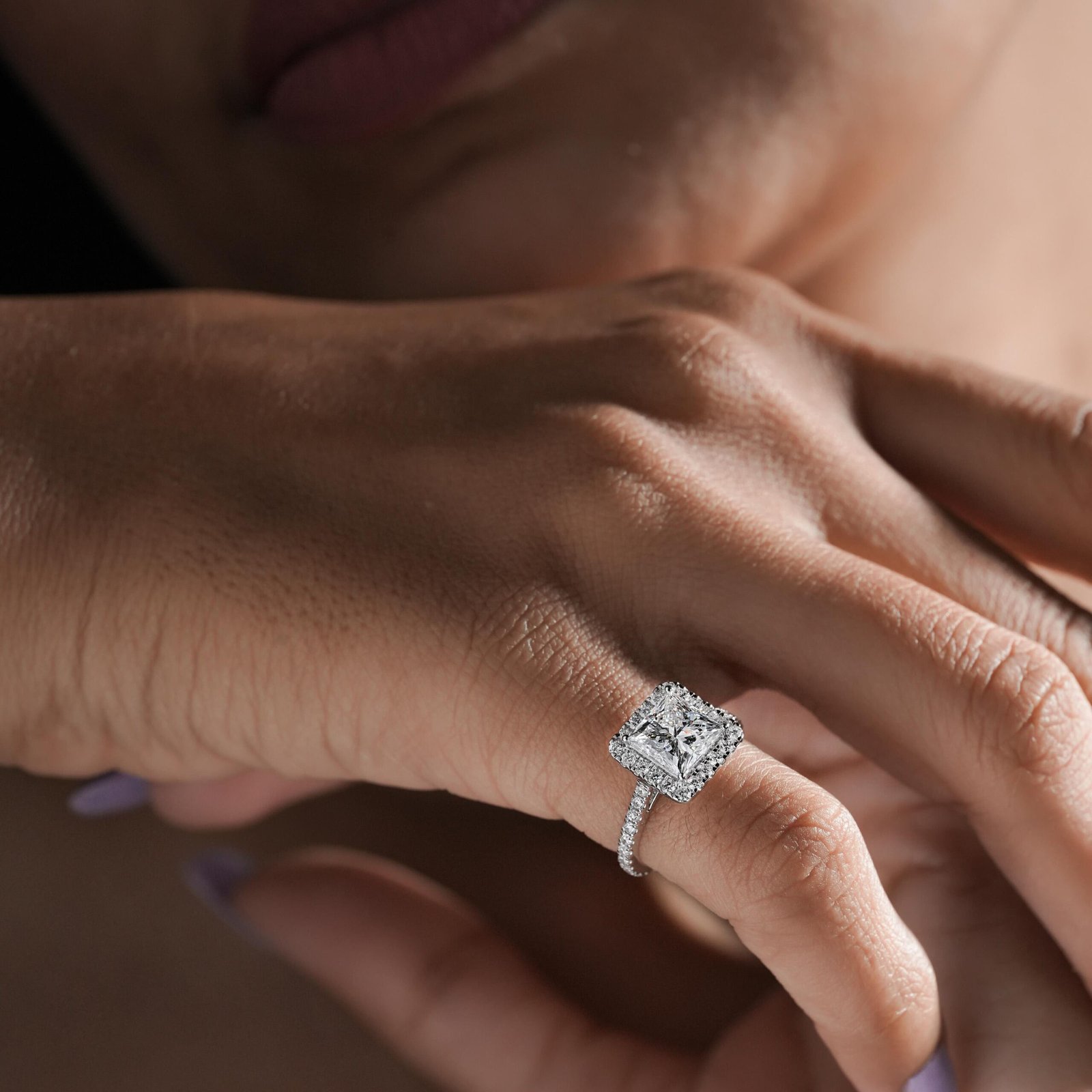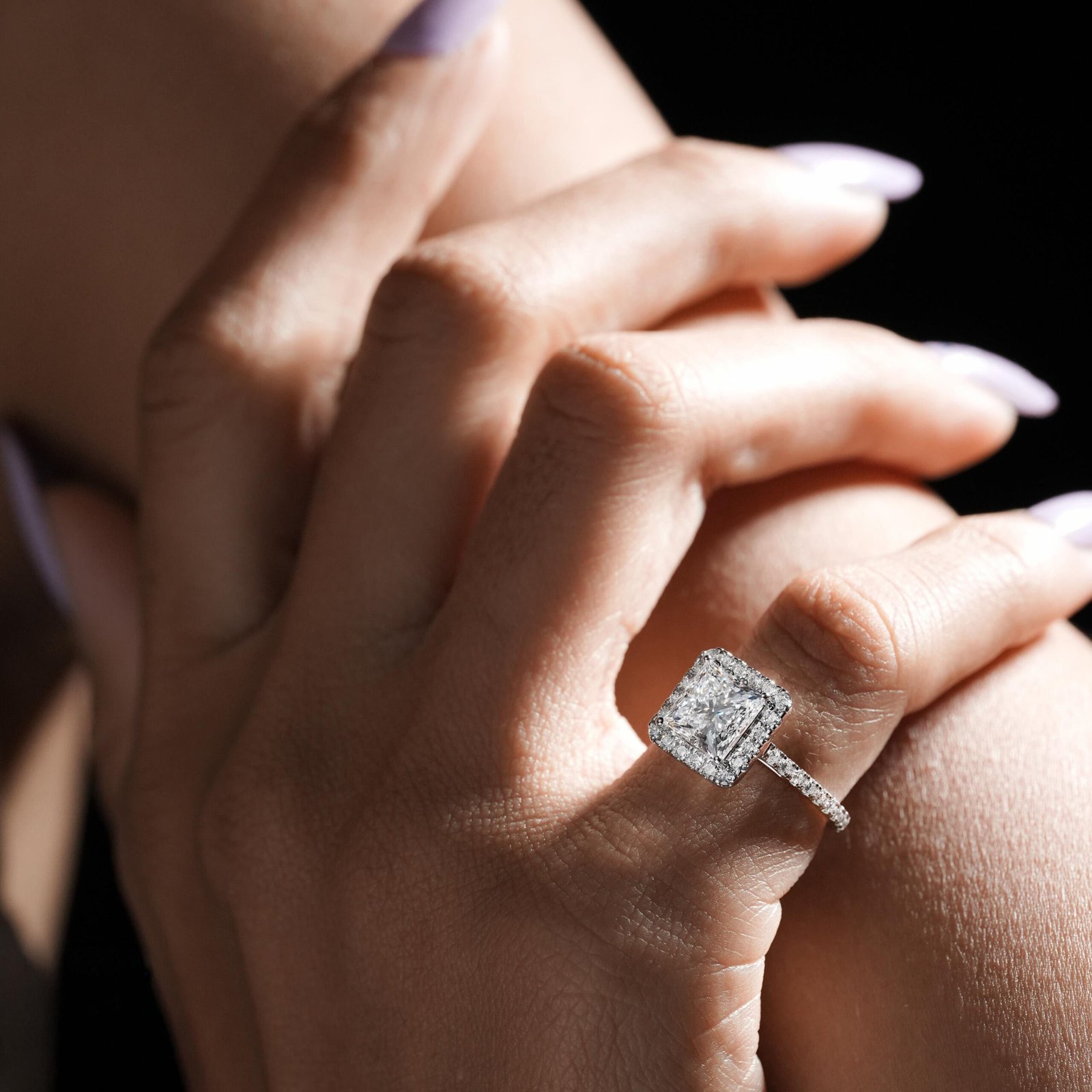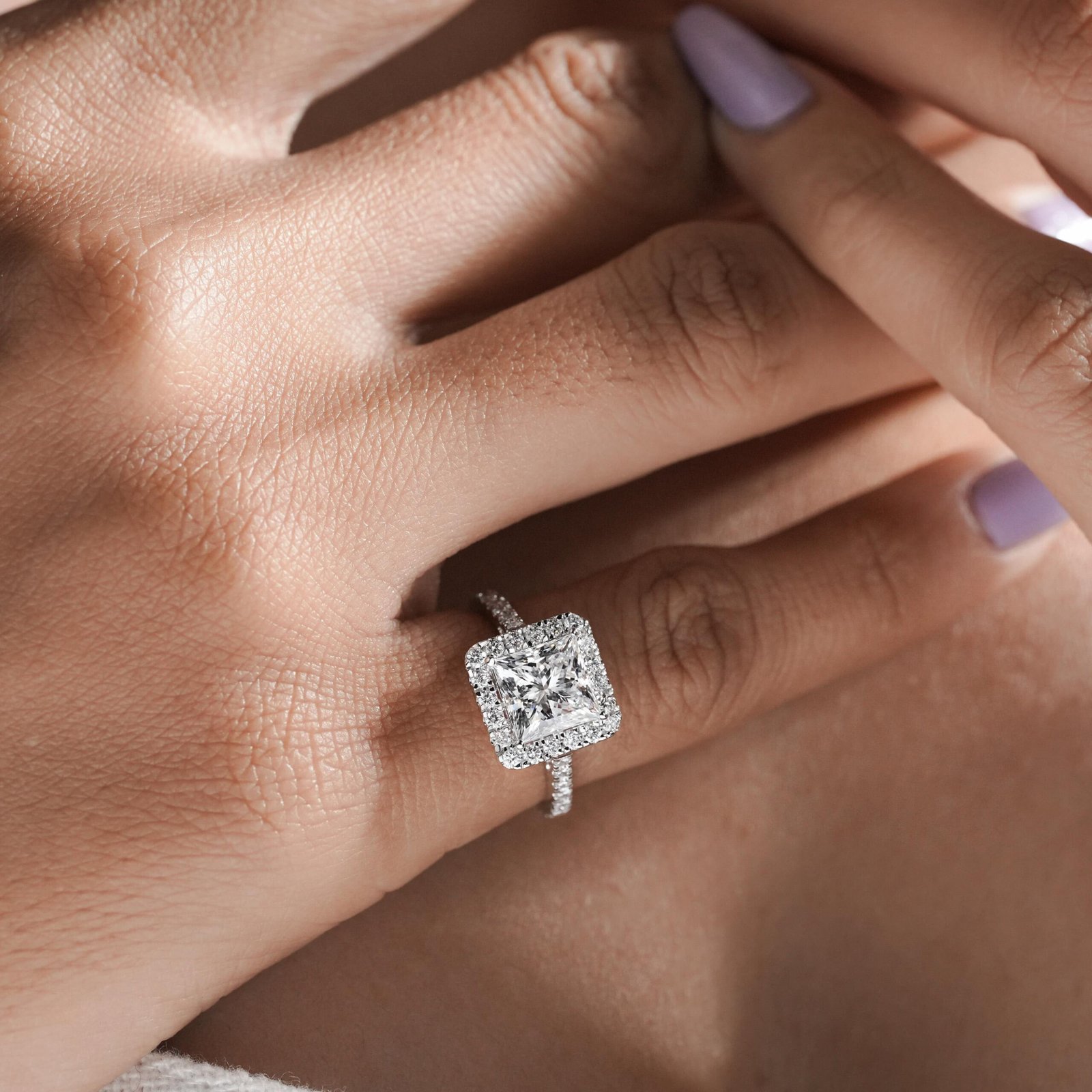 Elegant Princess Cut Halo Diamond Ring by OTP Jewelry, featuring an IGI-certified lab-grown princess-cut center stone surrounded by a radiant diamond halo and pave band. A bold and timeless choice, perfect for engagements, weddings, and anniversaries.
