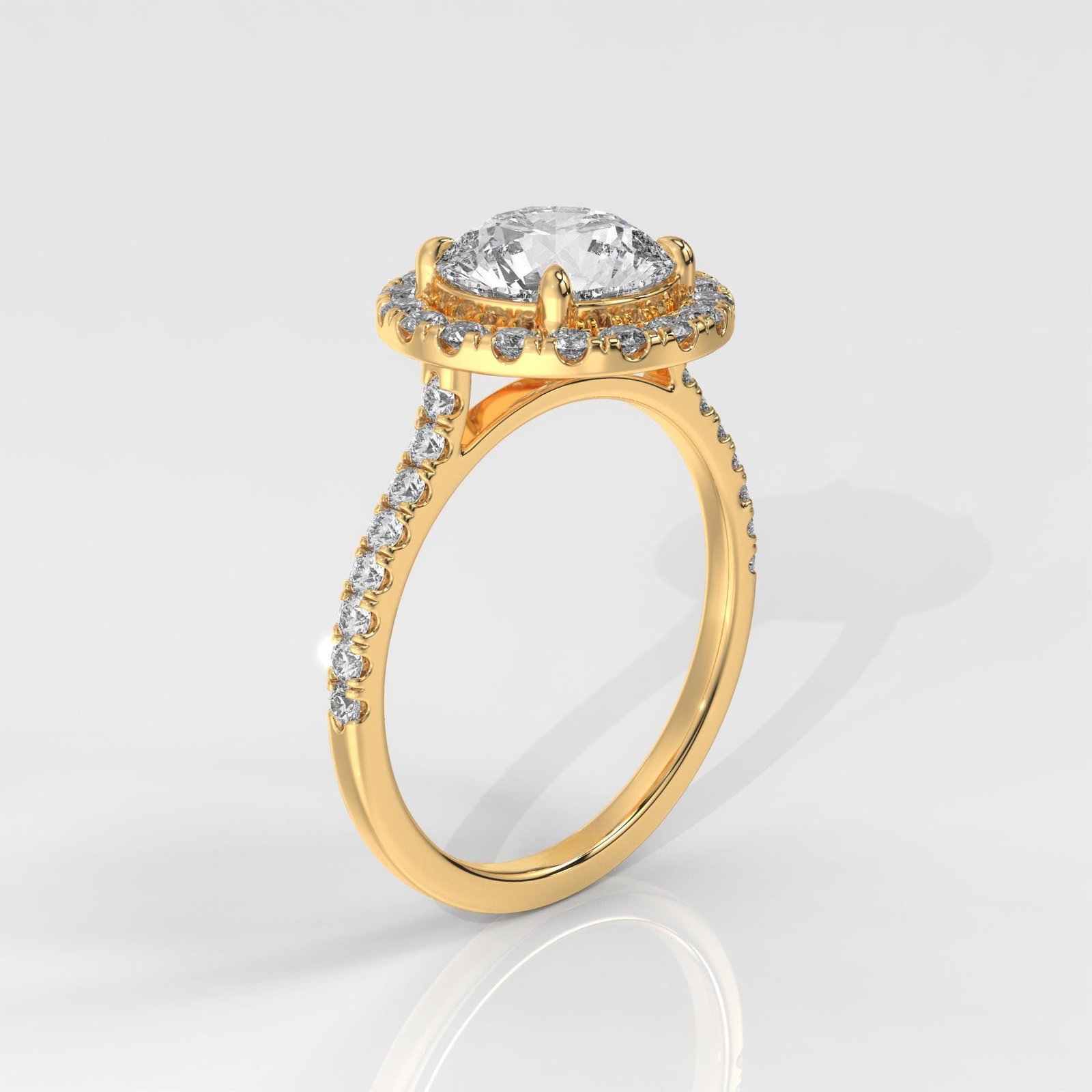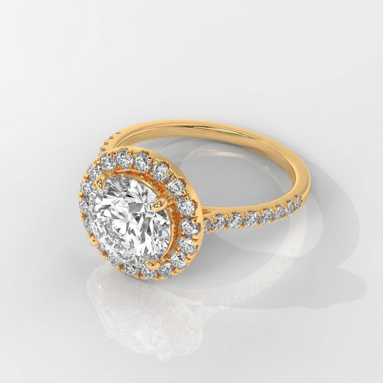 Dazzle in timeless elegance with this 14K Gold Round Brilliant Halo Engagement Ring, featuring an IGI-certified lab-grown center diamond surrounded by a sparkling halo and diamond-studded band. A symbol of everlasting love and brilliance.