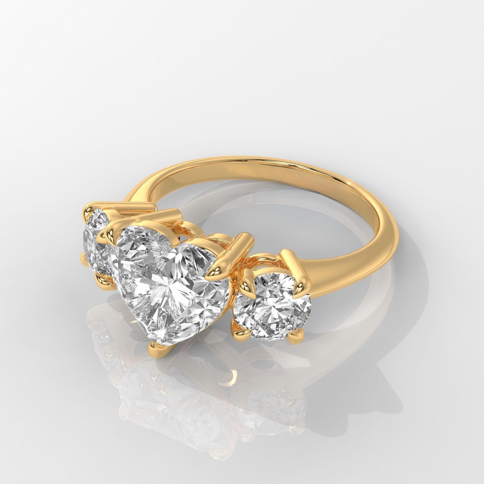 Celebrate love in its truest form with our 14K Gold Heart-Shaped Three-Stone Diamond Ring ? a stunning piece that captures the essence of romance, unity, and enduring commitment. At the heart of this elegant design lies a brilliant IGI-certified lab-grown heart-cut diamond, perfectly framed by two round side stones that symbolize your past, present, and future together.